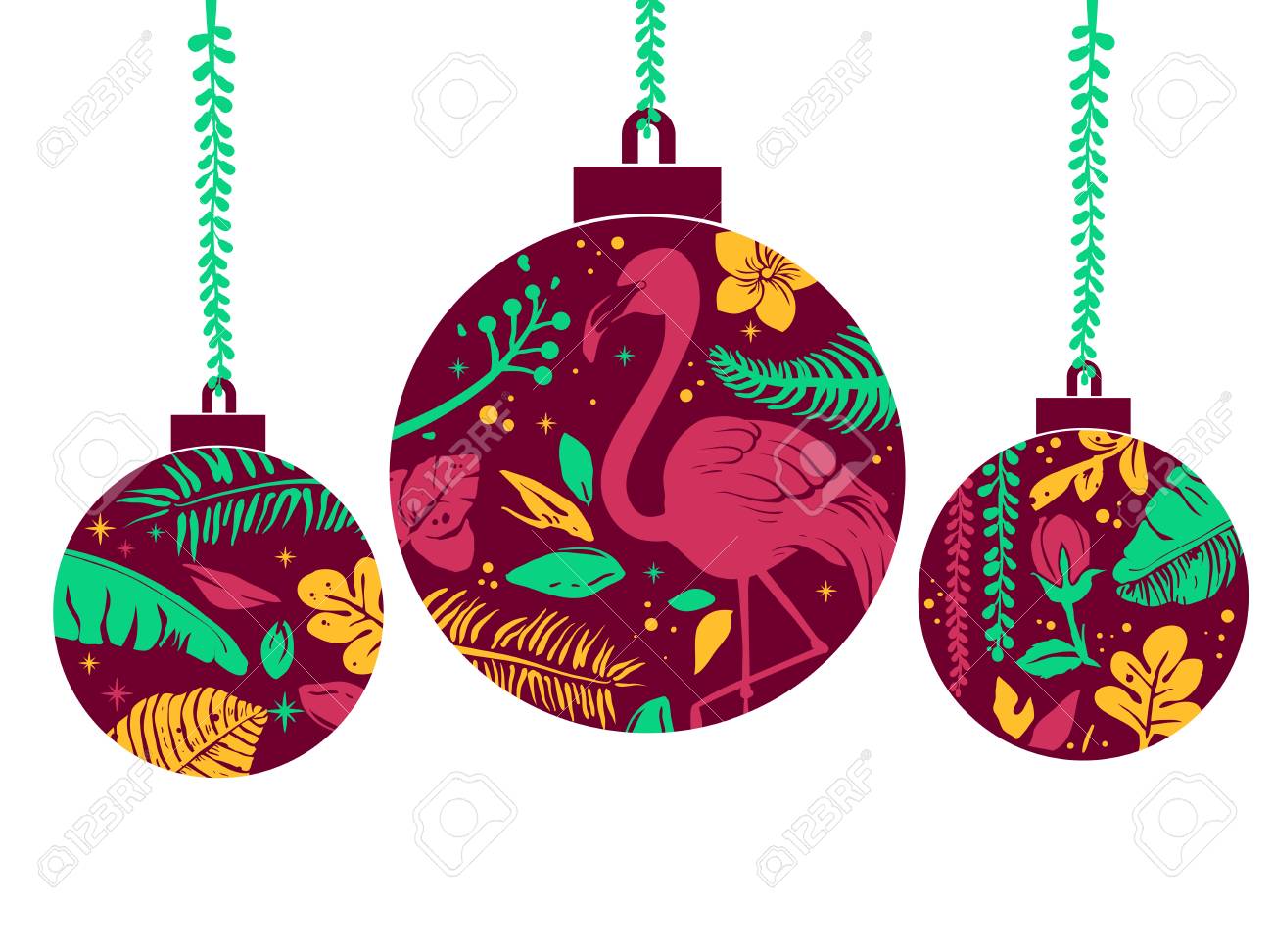 Illustration De Pochoir De Boule De Noël De Thème Tropical Avec Plumes Feuilles Fleurs Et Flamant