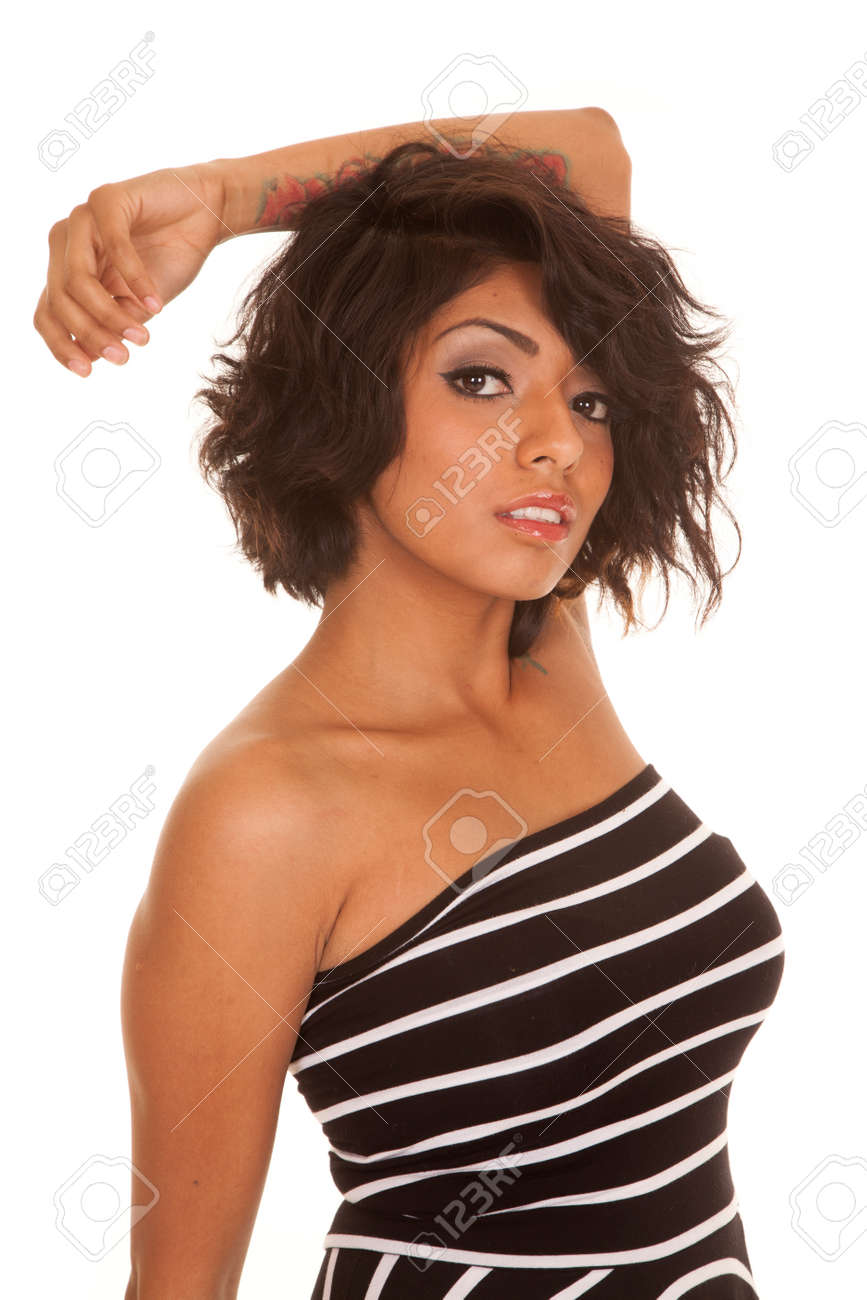 Une Femme Hispanique Dans Sa Robe à Rayures Noir Et Blanc Avec Son Bras Sur Sa Tête Et Un Tatouage Sur Son Bras